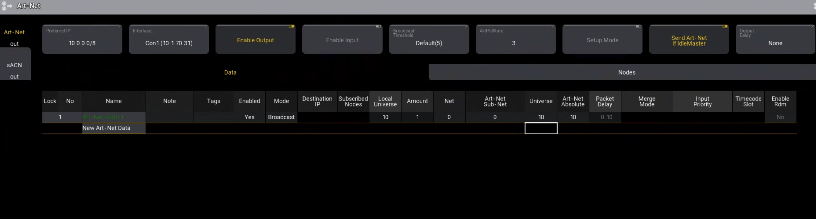 Enabled: Yes Mode: Broadcast Destination IP: blank Local Universe: 10 Amount: 1 Net: 0 Art-Net Sub-Net: 0 Universe: 10 Art-Net Absolute: 10